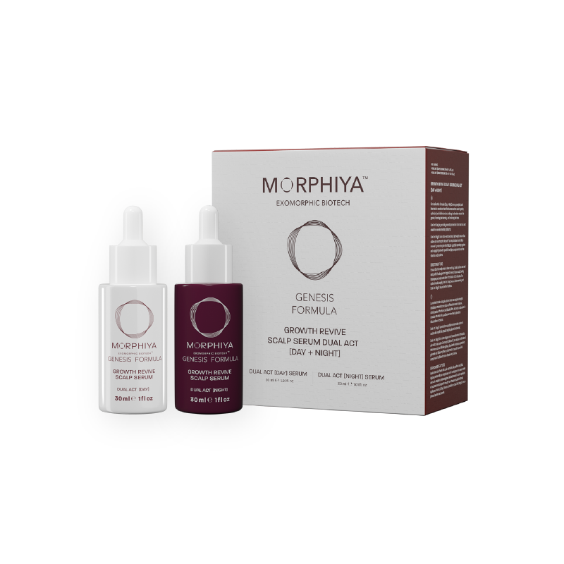 DualAct™ [Night] serum sadrži 16.2 miliona Hybrosomes™ čestica po kapljici, formulisanih od mlečnih i grožđanih ekstrakata i pokretan Exomorphic Biotech™ tehnologijom. Ovaj lagani, brzo upijajući serum stimuliše obnavljanje folikula dlake, nadoknađuje esencijalne nutrijente i pruža duboku regeneraciju tokom noći.